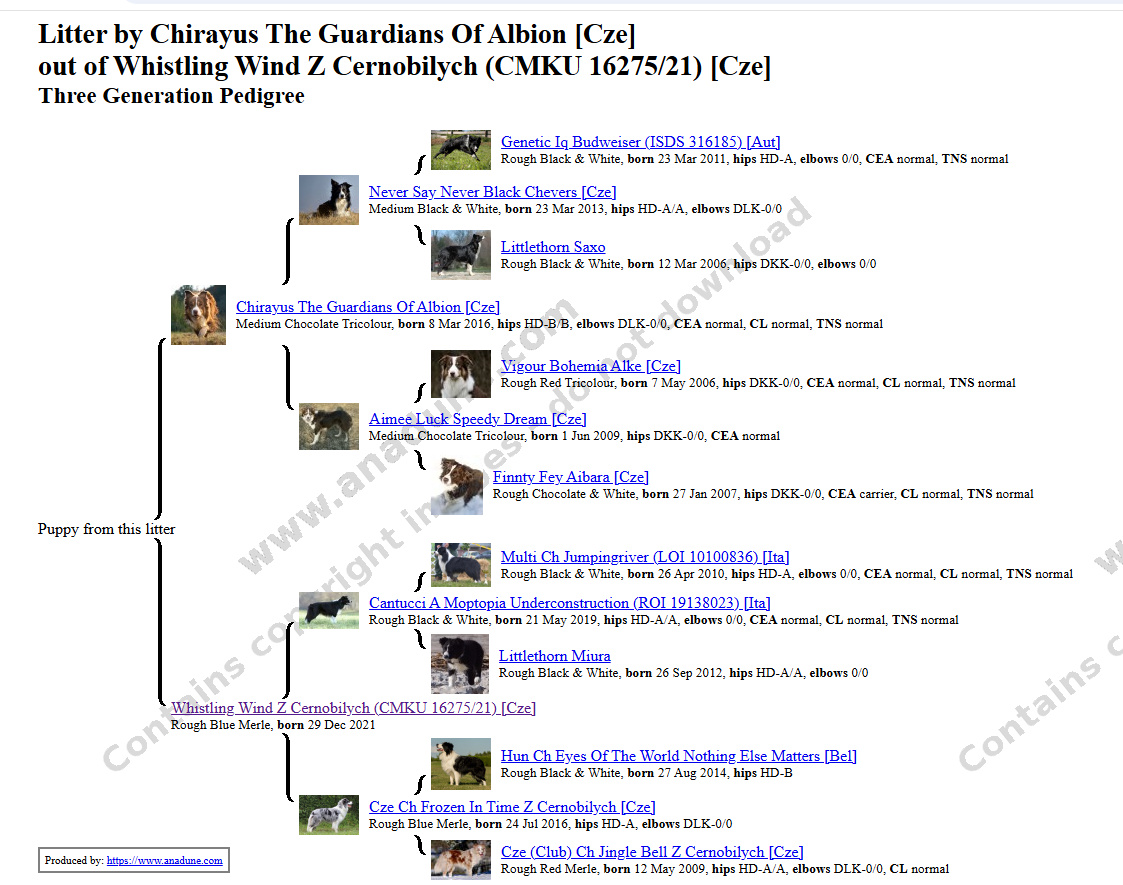 otcem je Chirayus the Guardians the Albion, matka je Whistling Wind z Černobílých.
